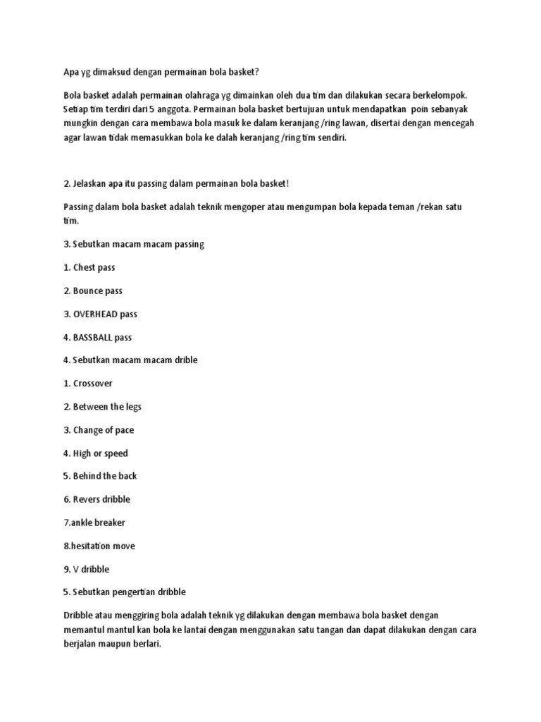 passing sendiri diketahui umumnya dilakukan dengan satu atau dua tangan. bola voli dimainkan pada lapangan dengan dengan ukuran tertentu dimana pada tengah lapangan terdapat sebuah net net atau jaring yang memisahkan wilayah permainan kedua grup. Dari tiap pelanggaran ini terdapat hukuman dari yang paling ringan seperti turnover, hingga yang paling berat seperti fouled out dan skorsing. passing bisa dilakukan dengan kecepatan tinggi atau secara perlahan.teknik passing dalam olahraga bola basket terdiri atas beberapa macam, yaitu: dalam permainan bola basket ada beberapa jenis menggiring (dribble) bola basket yang disesuaikan dengan kebutuhan dalam permainan.